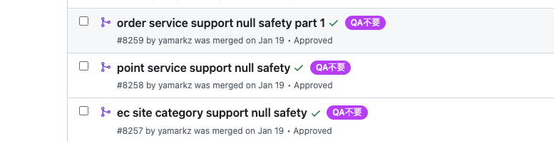 そういった場合には、自分たちでNull Safetyの移行を進めるようなPRを作成して、移行を進めてもらうようにパッケージオーナーにお願いしていく動きで解決していきました。 また、一部のパッケージでは残念ながらオーナーシップを失っているものもあったため、そのケースに該当したものは別パッケージへの乗り換えも行っています。